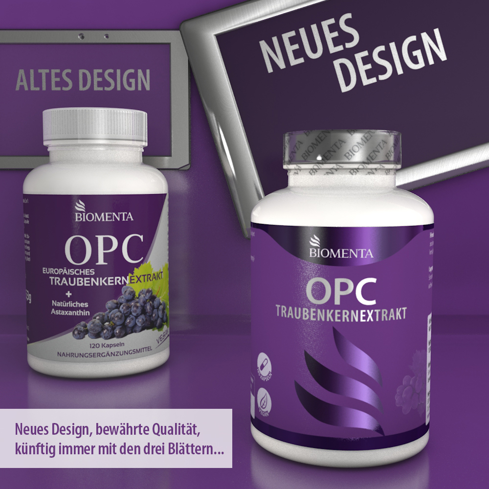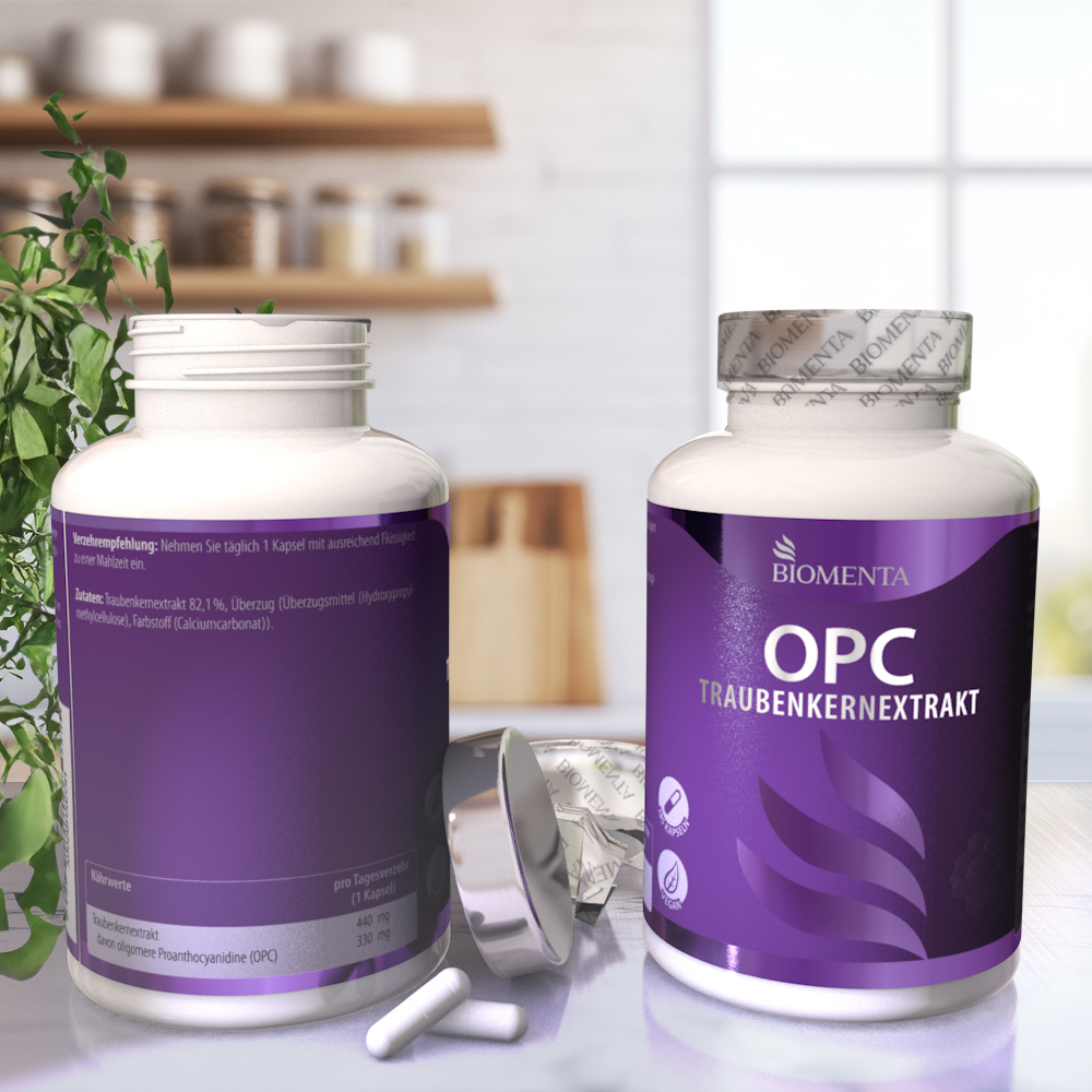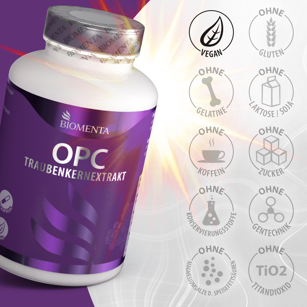 - OPC: Oligomere Proanthocyanidine sind natürliche sekundäre Pflanzenstoffe aus Trauben und gehören zu den Polyphenolen, einer Stoffklasse, die aufgrund ihrer vielseitigen Eigenschafen häufig in Supplements eingesetzt wird.
