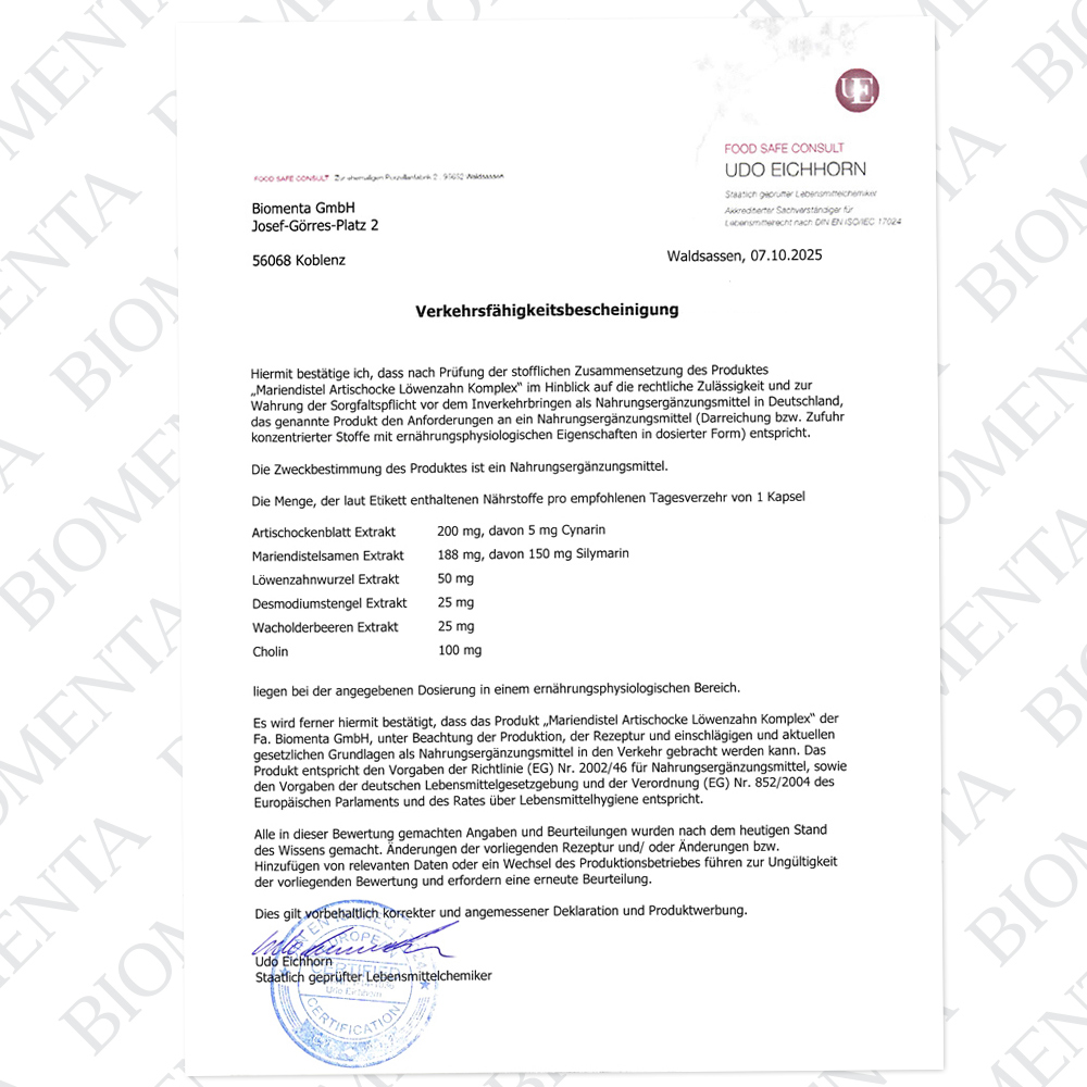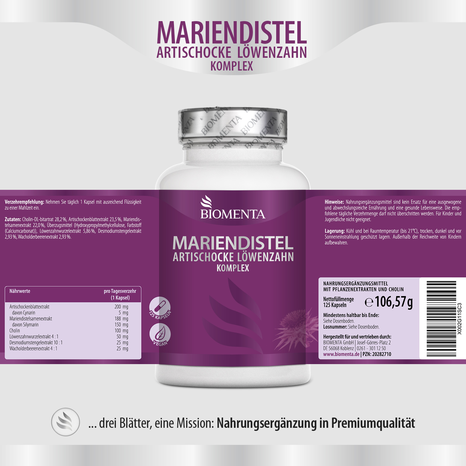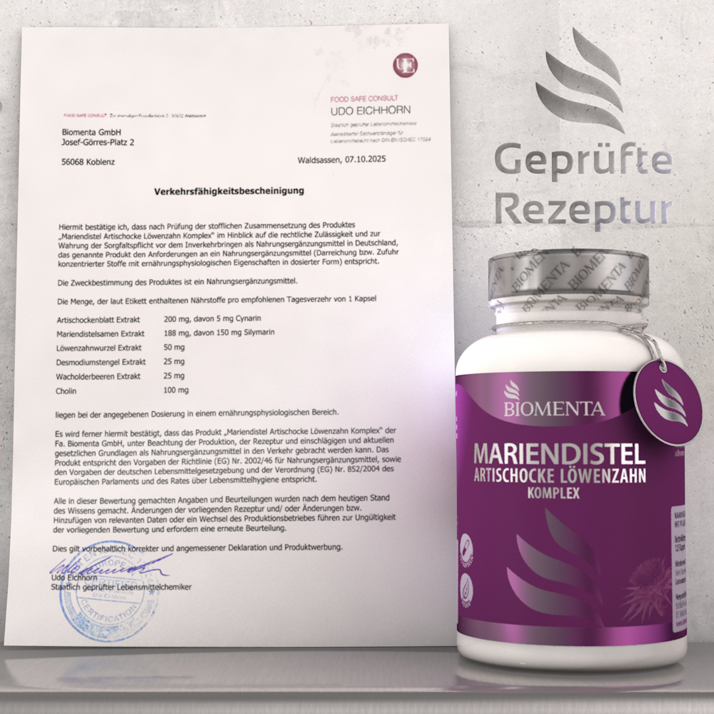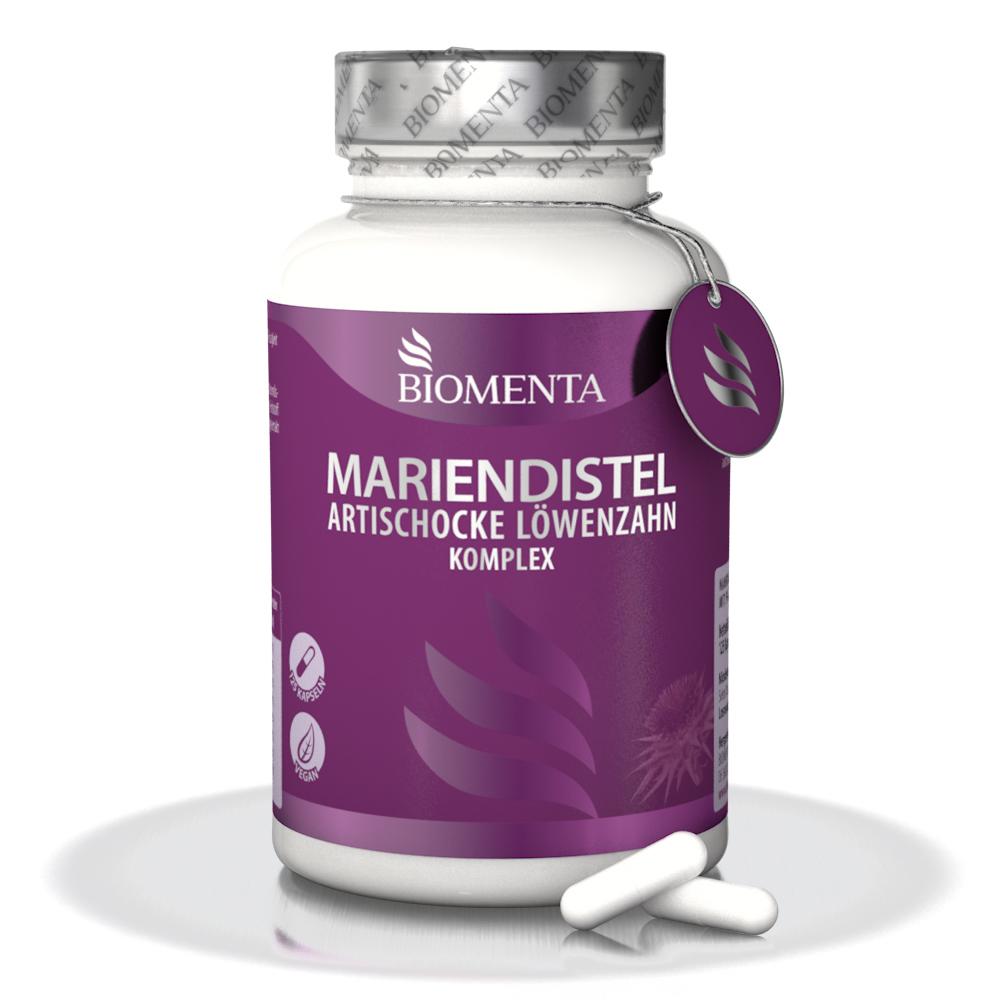 [234,49€/1kg] BIOMENTA Mariendistel Artischocke Löwenzahn Komplex 125 Kapseln - vegan