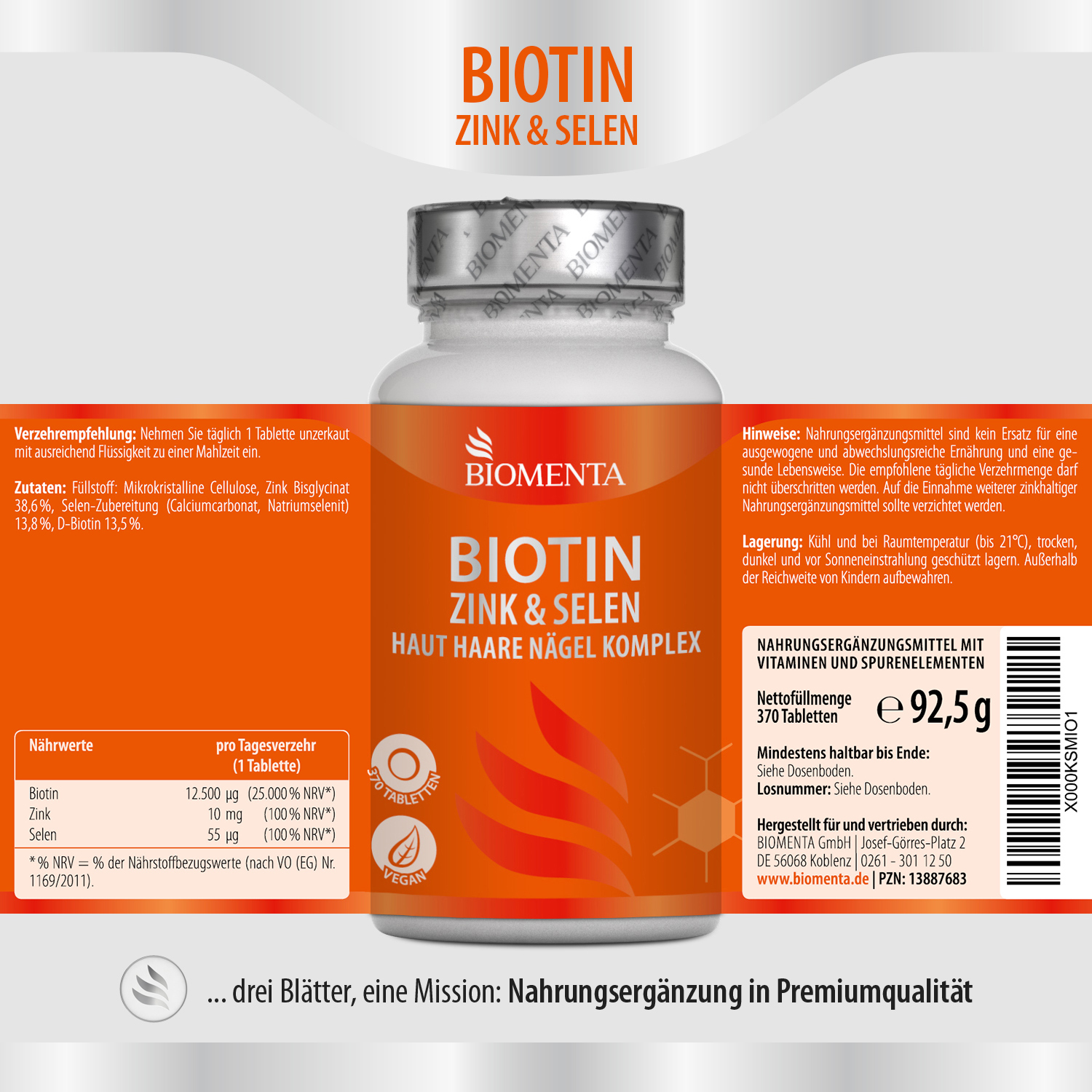 [194,49€/1Kg] BIOMENTA Biotin Zink Selen & Haut Haare Nägel – 370 Tabletten – vegan