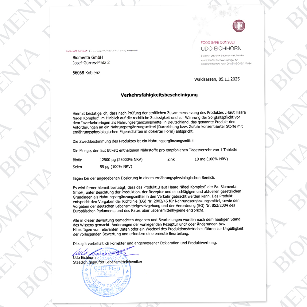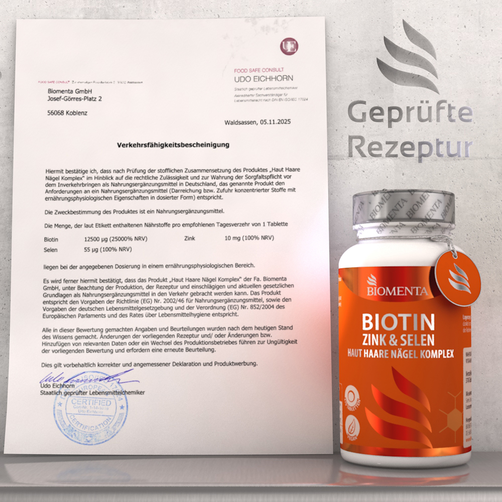 - Made in Germany – BIOMENTA steht seit mehr als 40 Jahren für die Entwicklung hochwertiger Nahrungsergänzungsmittel – sorgfältig hergestellt und geprüft in Deutschland.