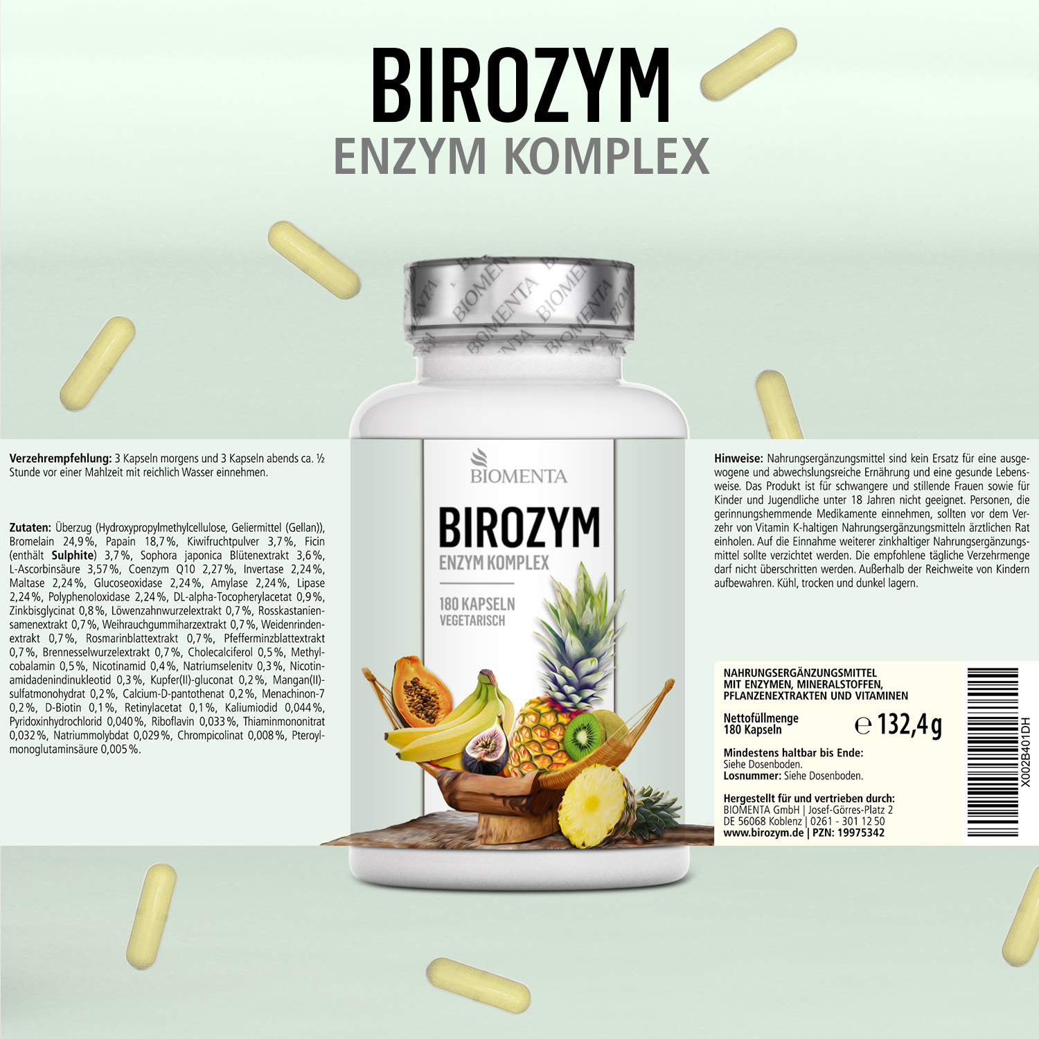 Der BIROZYM Enzym Komplex ist die ideale Wahl für alle, die ein hochdosiertes Enzympräparat in Premium-Qualität suchen und kaufen möchten. Mit seiner synergetischen Kombination aus natürlichen Enzymen aus Früchten und essenziellen Co-Enzymen bietet er maximale Wirksamkeit und beste Bioverfügbarkeit.