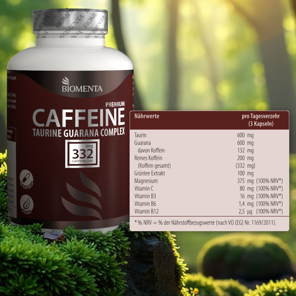 [121,97€/1Kg] BIOMENTA Caffeine Taurine Guarana Premium Komplex – 180 Kapseln – vegan