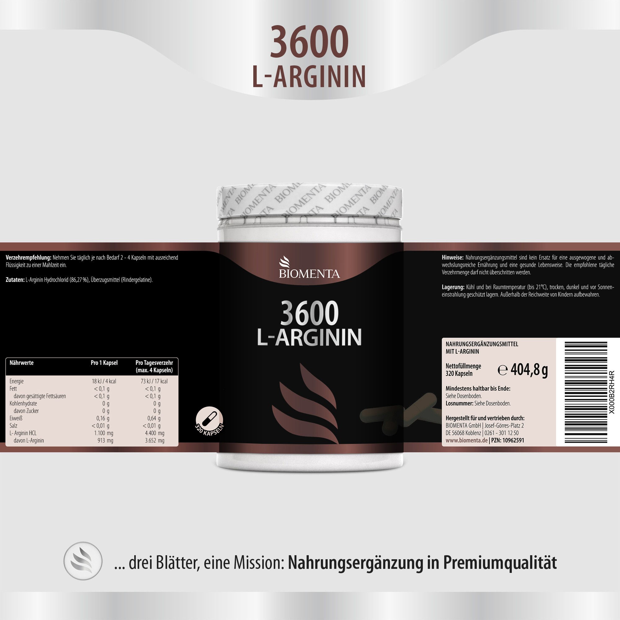 [64,20€/1kg] BIOMENTA L-Arginin 3600 – 320 L-Arginin Kapseln
