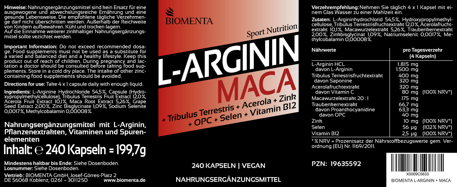 [100,10€/1kg] BIOMENTA L-Arginin + Maca – 240 Kapseln – vegan