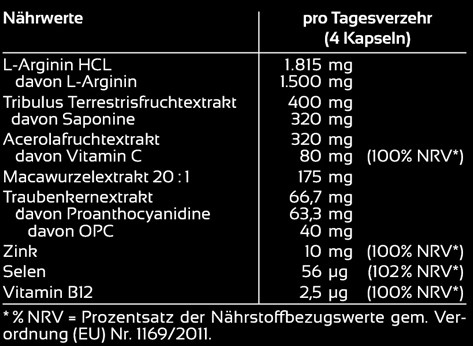 L-Arginin Hydrochlorid (54,50%), Überzugsmittel (Hydroxypropylmethylcellulose), Tribulus Terrestris Fruchtextrakt (12,00%), Vitamin C-haltiger Acerola Fruchtextrakt (10,10%), Maca Wurzelextrakt (5,26%), Traubenkernextrakt (2,00%), Zink Bisglycinat (1,09%), Natriumselenit (0,0017%), Methylcobalamin (0,00008%).