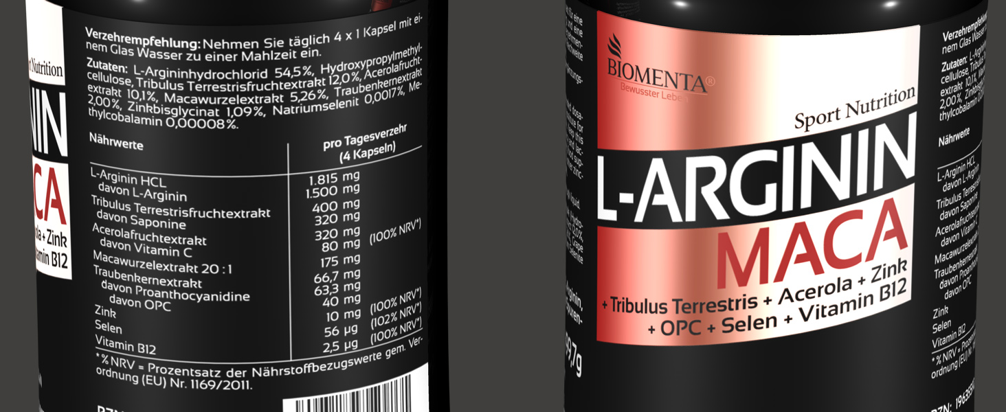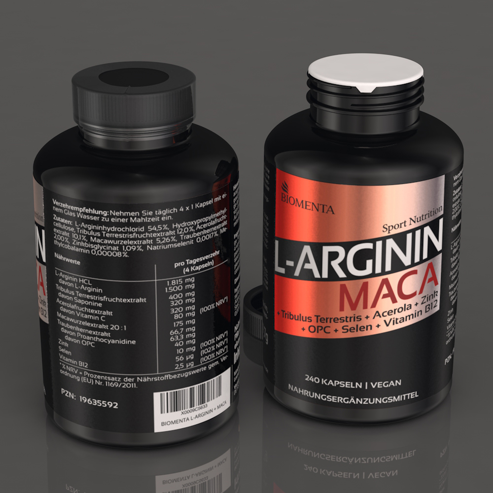Das BIOMENTA L-Arginin + Maca Nahrungsergänzungsmittel vereint hochwertige Pflanzenextrakte, darunter die schon seit Jahrhunderten von den Naturvölkern der peruanischen Anden geschätzte Maca Root und essentielle Mikronährstoffe in einer optimal abgestimmten Rezeptur. Jede Tagesportion liefert eine effektive Kombination aus L-Arginin, Maca, Tribulus Terrestris, OPC-Traubenkernextrakt und Acerola (natürliches Vitamin C) sowie den wichtigen Spurenelementen Zink Bisglycinat, Selen und Vitamin B12 (Methylcobalamin).