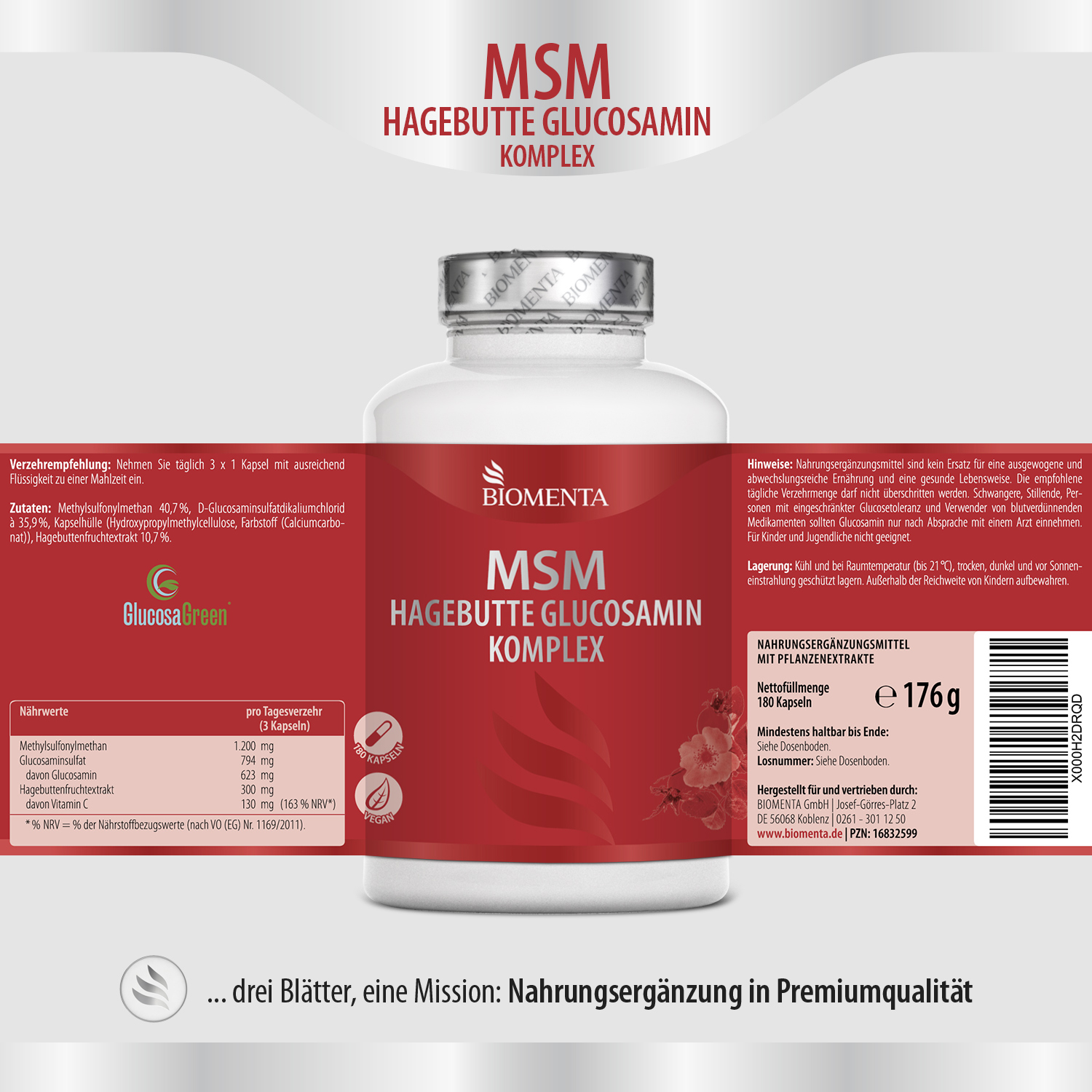 [102,62€/1kg] BIOMENTA MSM + Hagebutte + Glucosamin – 180 Kapseln – vegan